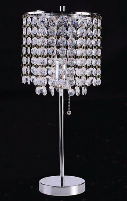 | This 19-inch tall table lamp features diamond-cut faux crystals and a stable, chrome base.