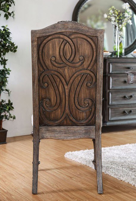 | The ivory fabric upholstery provides a stunning contrast against the rustic natural tone finish for a look that is as cozy as it is chic. Intricate leg designs play beautifully off the delicately cut backs for a look that will inspire and amaze.