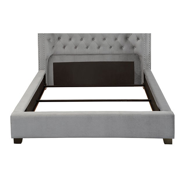| Kick back and relax in this transitional style bed designed to maximize your comfort in the ultimate fashion! Lean back and feel the full support of the padded flannelette fabric and button tufted wingback headboard. The nailhead trim adds a touch of sophistication for a modernized look, upheld by wooden framework. *Please note that the base price only includes (1) bed, you would need to add additional nightstands, dressers, mirrors, chests, etc. as necessary to complete your bedroom set to your liking.