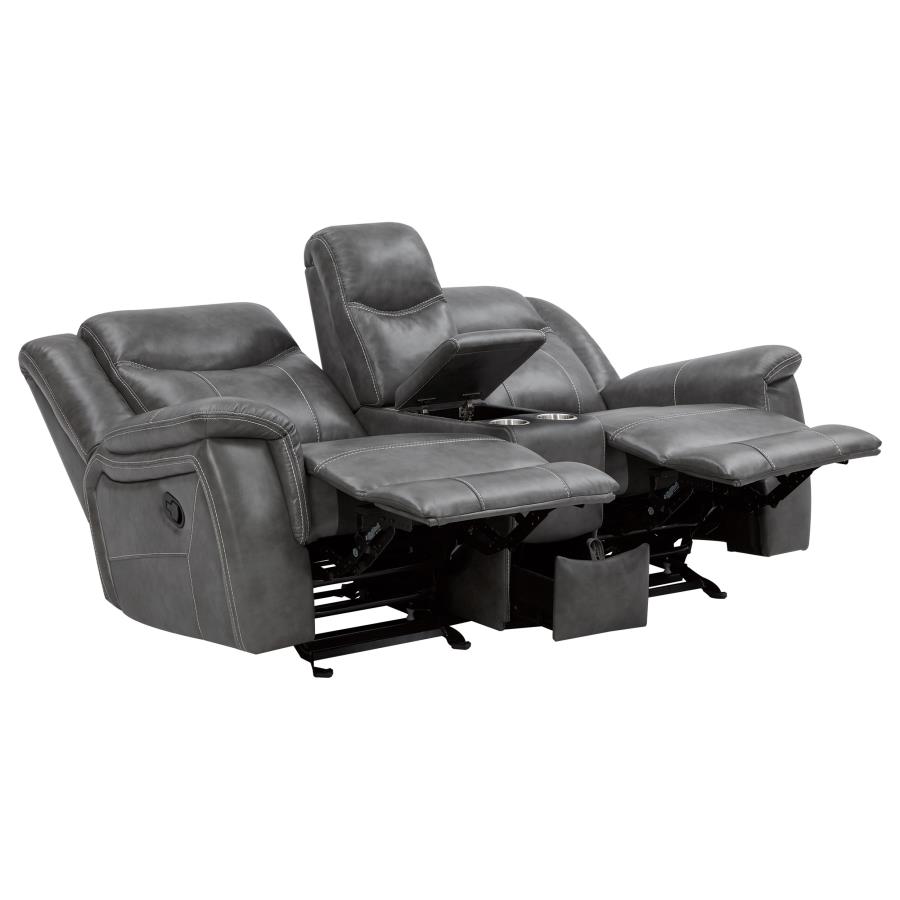 | Grey is the trendy color these days and it doesn't look any better than on this opulent motion sofa. It features angled seat backs with extra padded headrests for ultimate luxury. Armrests and even the leg rest on the recliner are padded for extra comfort. Wrapped in the coolest of cool grey leather-like upholstery for a look that's uber-fashionable. This sofa will definitely steal the show in any living room or home rec room. *Please note that the base price only includes (1) sofa. Please add the additional items to customize this set to your liking.