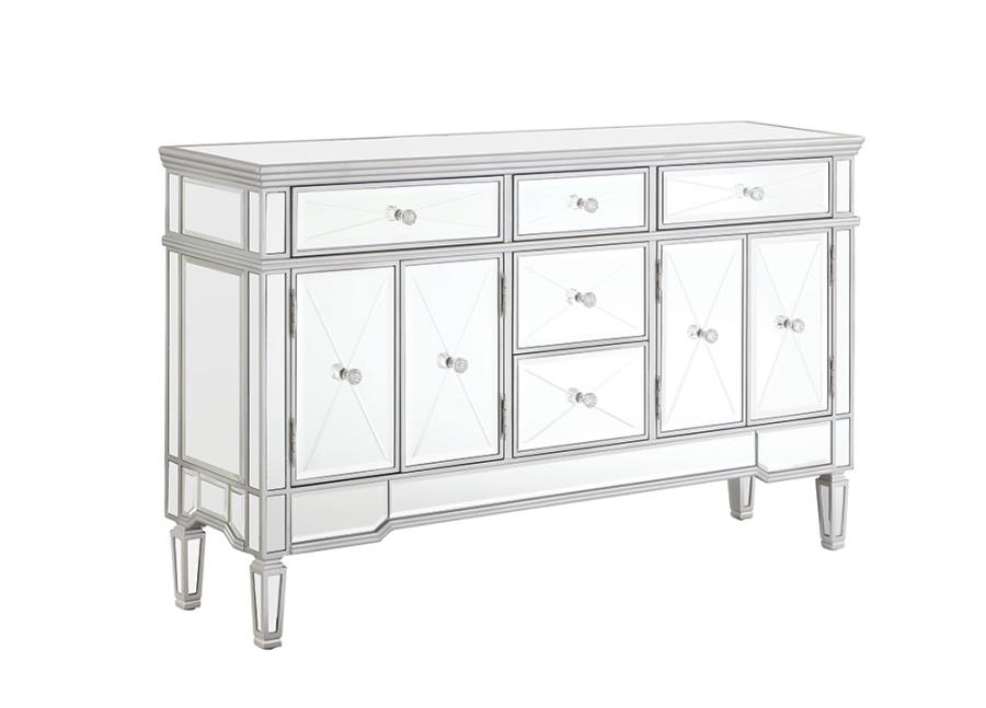 | This mirrored accent cabinet has plenty of storage and panache. Fashioned from a combination of materials, it brings modern appeal and convenience to the home. It features birchwood and MDF construction in a silver finish to match the lustrous mirrored accents. Nine mirrored drawers with crystal hardware feature plenty of storage capabilities for all your needs. It's a fine addition to a modern styled living room or entertainment room.