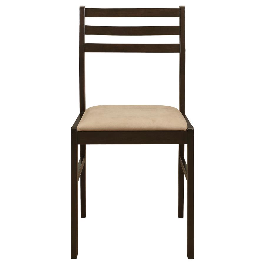 Elevate the tasteful look and feel of a dining nook or parlor with this chic, stylish dinette set. Its compact size and sleek design blend effortlessly into rooms of all shapes, sizes, and decor styles. Soft, cream colored upholstery covers the plush, padded seats of its two comfortable chairs. The classic glamour of its round, wooden table is enhanced by the versatile functionality of a convenient folding leaf. A deep, rich cappuccino finish and sleek, graceful lines complete the glamorous look of this elegant three-piece set.
