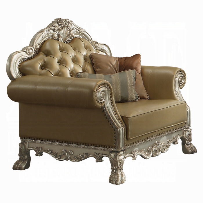 | The Dresden gold patina and bone faux leather chair has a traditional feel, featuring decorative carvings, inlay veneer ball and claw feet and hand brushed gold accents. The seat and back have a faux leather button tufted cushion with Nailhead trim. Comes with 2 pillows to add comfort with sophistication. This chair is perfectly suited for any room in your home that needs a bit of class. Some Assembly Required.