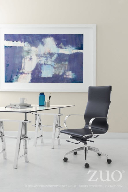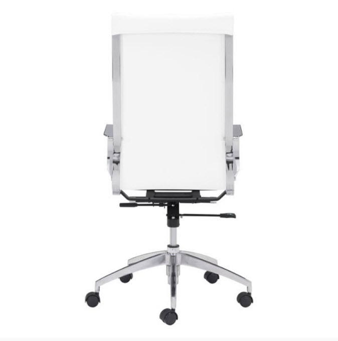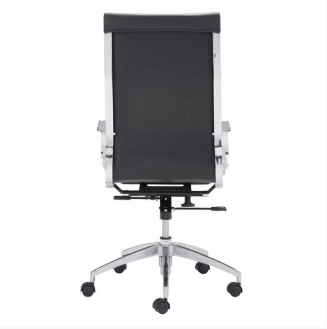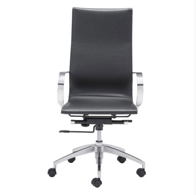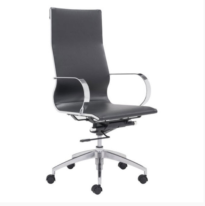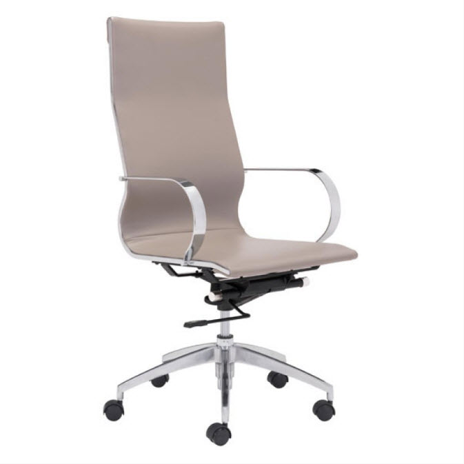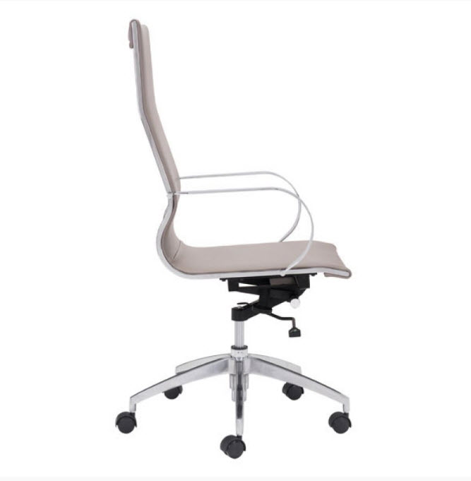 | Glider high back office chair features a slim yet comfortable profile, high back with added lumbar support, soft leatherette upholstery and chrome arms. You will sit in elegant fashion as smooth glides create effortless motion. Tilting mechanism and seat height are both adjustable as hydraulic piston sit on metal star base to seamlessly glide you into place. Color options are black, white, gray & taupe leatherette.