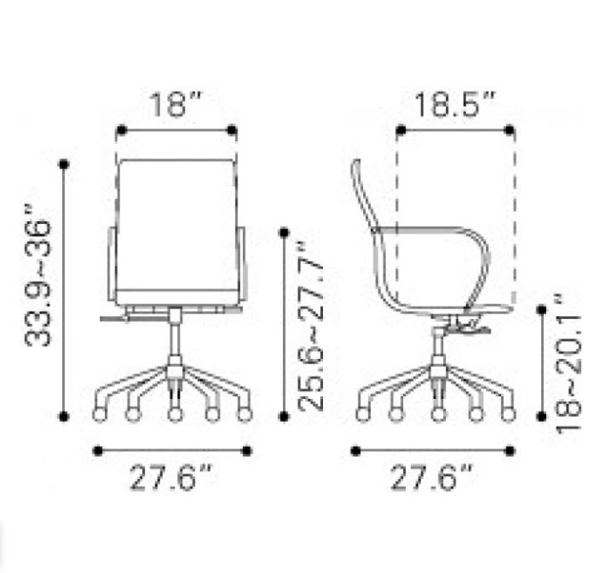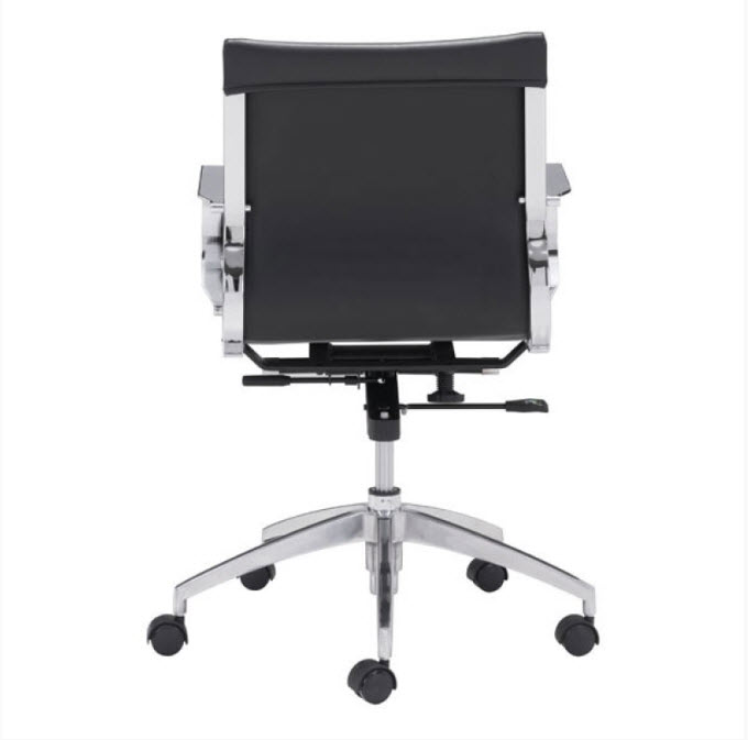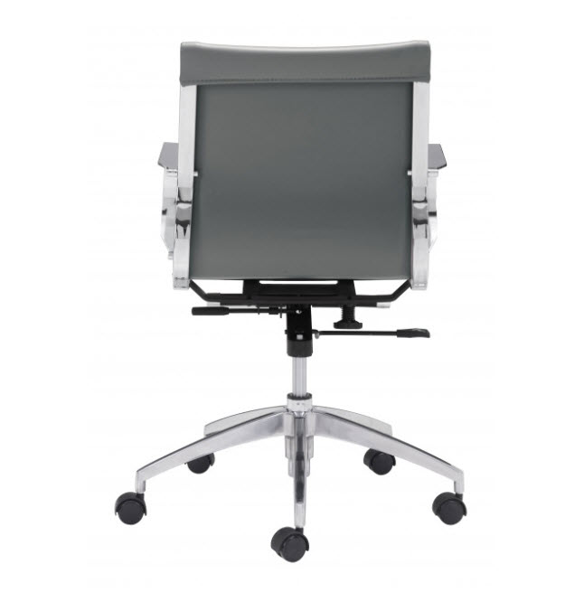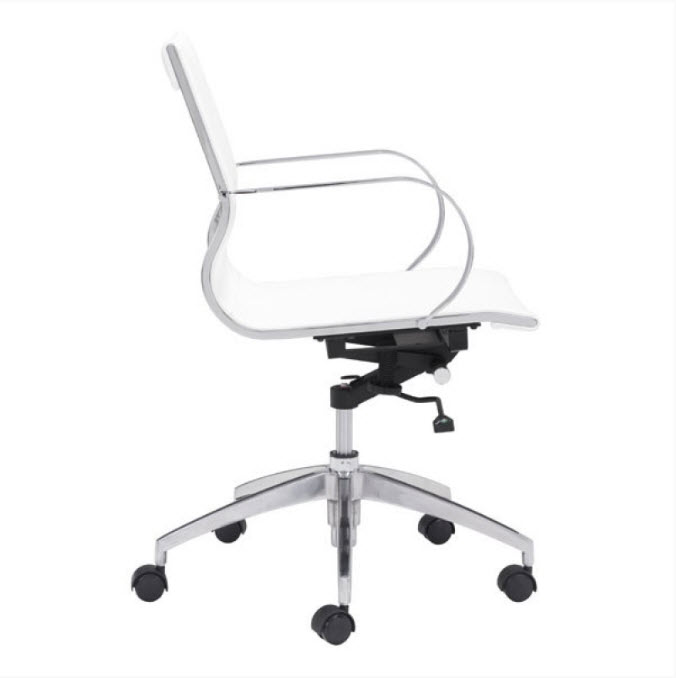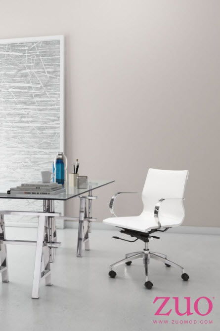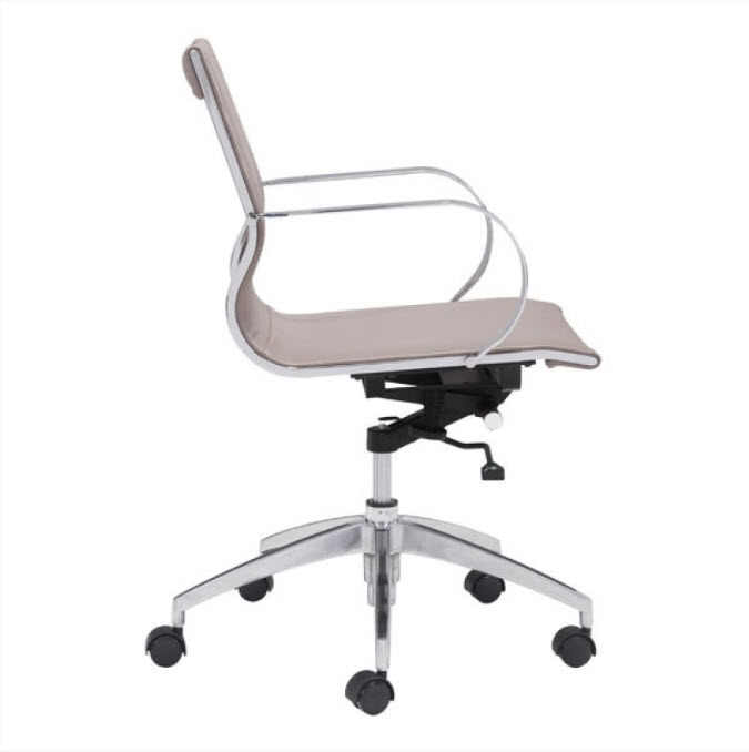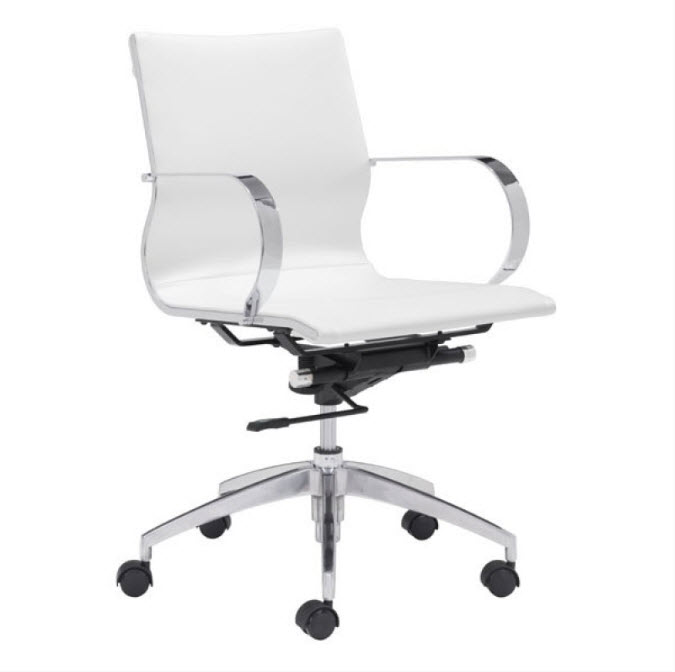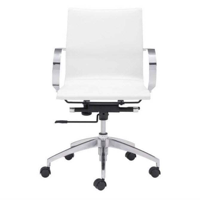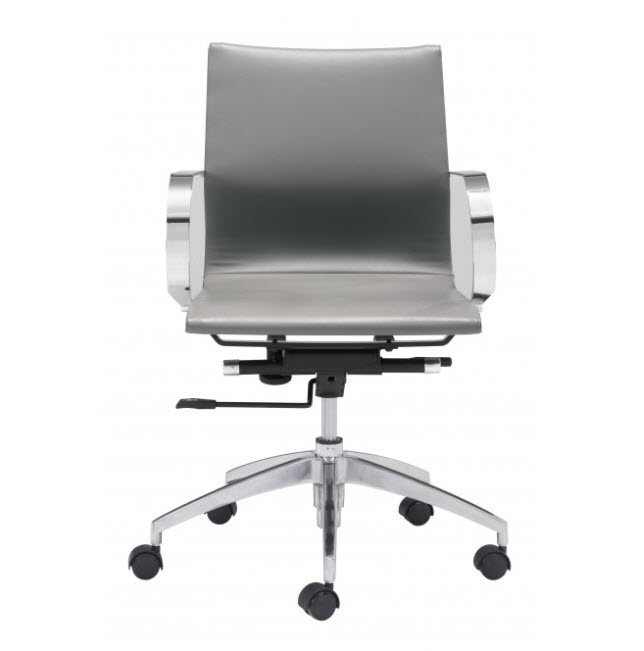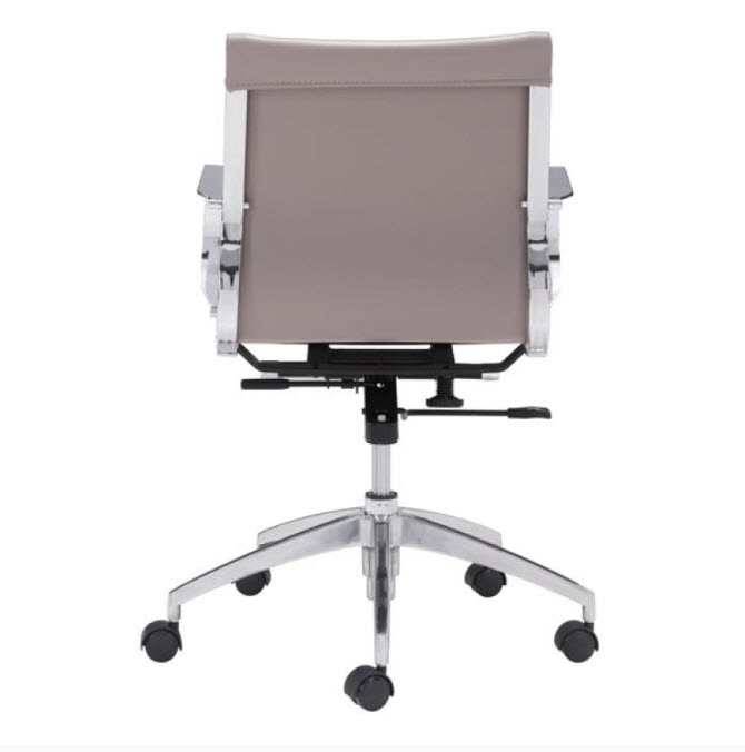 | Glider low back office chair features a slim yet comfortable profile with added lumbar support, soft leatherette upholstery and chrome arms. You will sit in elegant fashion as smooth glides create effortless motion. Tilting mechanism and seat height are both adjustable as hydraulic piston sit on metal star base to seamlessly glide you into place. Color options are black, white, gray & taupe leatherette.