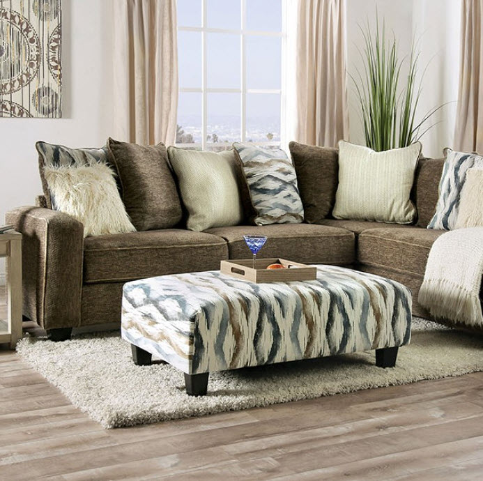 | Cozy up in this plush taupe sectional. It features upholstery that is super-soft, genuinely plush thanks to the addition of a superior group of scatter-back pillows. The fabric recalls visual aspects of a variety of wildlife and is pretty wild in itself. The ottoman matches by way of a printed surface, but offers plenty of contrast. Crisp tight welt trim creates a dynamic outline to enhance the design, and tapered wood block feet are stained black for a low key affair. *Please note that the base price only includes (1) sectional sofa. Please add the additional ottoman to customize this set to your liking.