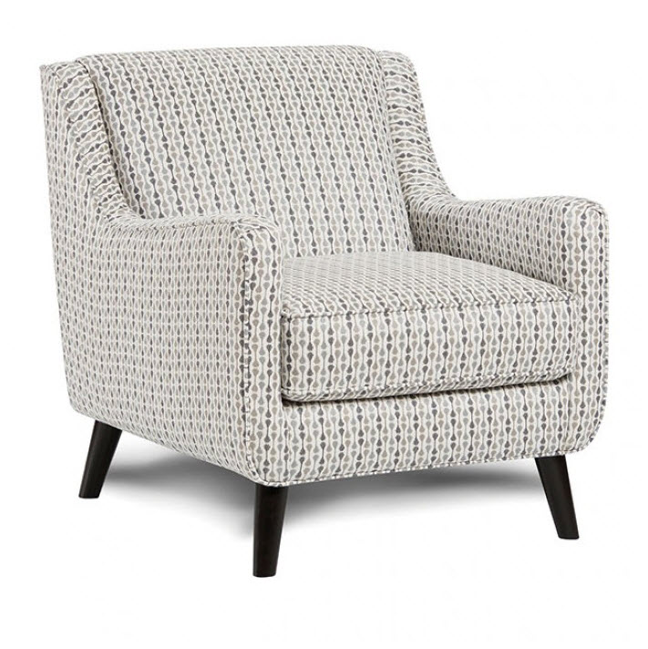 | The unique vintage pop art-inspired pattern features a myriad of flat-colored identical shapes that dominate the fabric upholstery of the chair that is a curiosity in itself. Sloping track arms contribute a modern feel that is reinforced by the tapered dark-stained block wood legs that firmly compliment the dynamic style. Welt cord trim provides a masked outline, camouflaged by the assortment of tones that makes the piece a cool addition to any room.