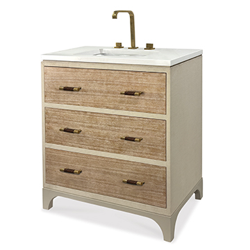 Expertly crafted from rich mahogany, this elegant sink chest blends timeless craftsmanship with modern sophistication. Upholstered in a neutral synthetic fabric known for its durability and wrinkle resistance, it offers both style and long-lasting performance. The eucalyptus veneered drawer fronts introduce natural warmth and refined texture, while braided leather pulls and brass hardware add a distinctive, artisanal touch. A sleek white quartz countertop enhances its contemporary appeal and durability, perfectly complemented by a smooth porcelain sink bowl for everyday functionality. Designed with versatility in mind, this sink chest is also available for purchase without the top.