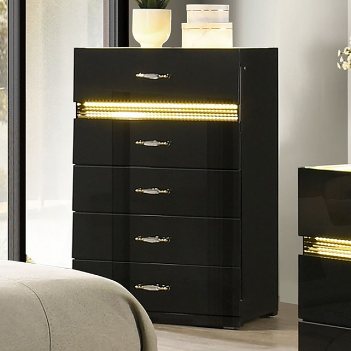 A luxurious contemporary bed featuring a padded faux fur headboard, sleek black finish, and elegant accents, designed to add comfort and a bold modern statement to any bedroom. *Please note that the base price only includes (1) bed. Please add the additional items to customize this set to your liking.