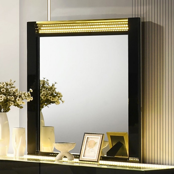 A chic, contemporary set featuring soft black faux fur, a padded LED-lit headboard, crocodile-texture accents, and gold hardware. Built from durable engineered materials with felt-lined drawers and smooth metal glides, this FOA exclusive delivers modern luxury and everyday convenience. *Please note that the base price only includes (1) Dresser. Please add the additional Mirror to customize this set to your liking.