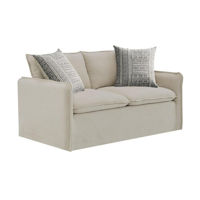 | The Upendo Loveseat combines casual elegance with everyday comfort. Featuring a soft beige linen-like fabric and clean track arms, it offers a cozy yet polished look. Two coordinating accent pillows—one solid beige, one with an Afro-esc pattern—add visual texture and support, making it a versatile centerpiece for relaxed living spaces.