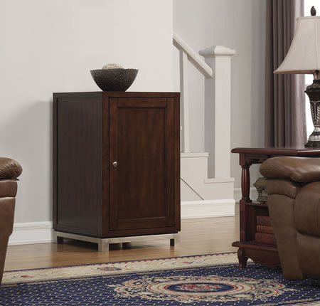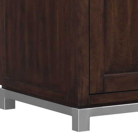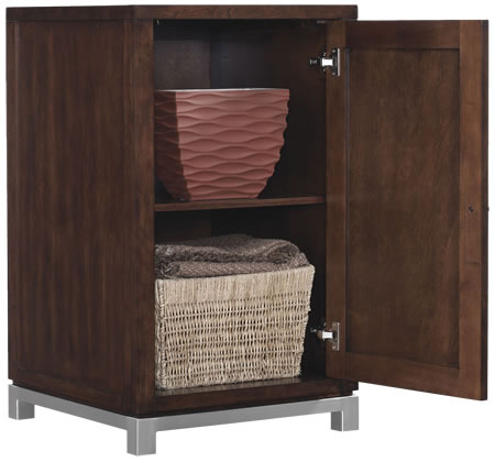 The Wesleyan lower storage cabinet in Meridian Cherry features a wood door that can be hung left or right and a shelf that can be adjusted or removed for additional space. Cabinet features brushed steel hardware and base.