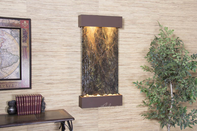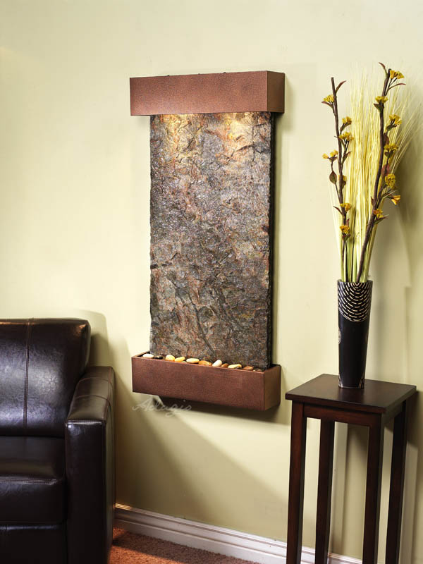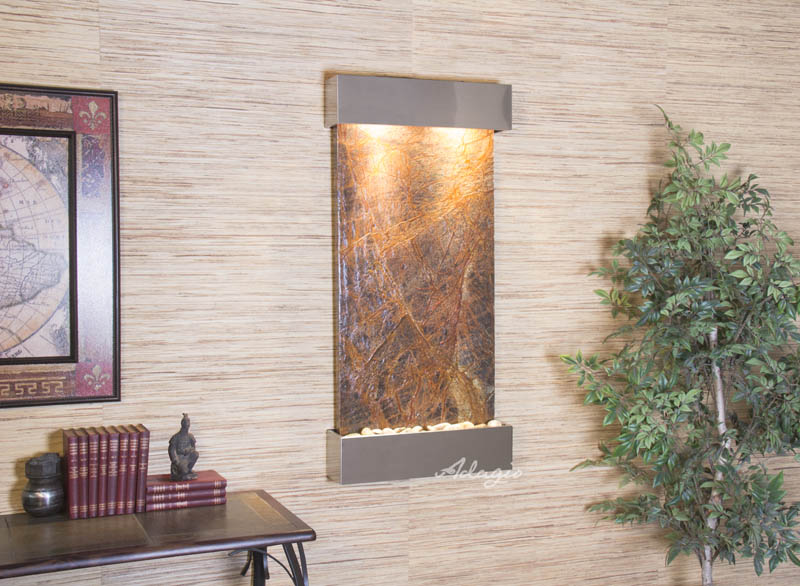 | Our indoor wall fountains add beauty to your home or office. This waterfall comes with a variety of attractive choices for finishes and surfaces.