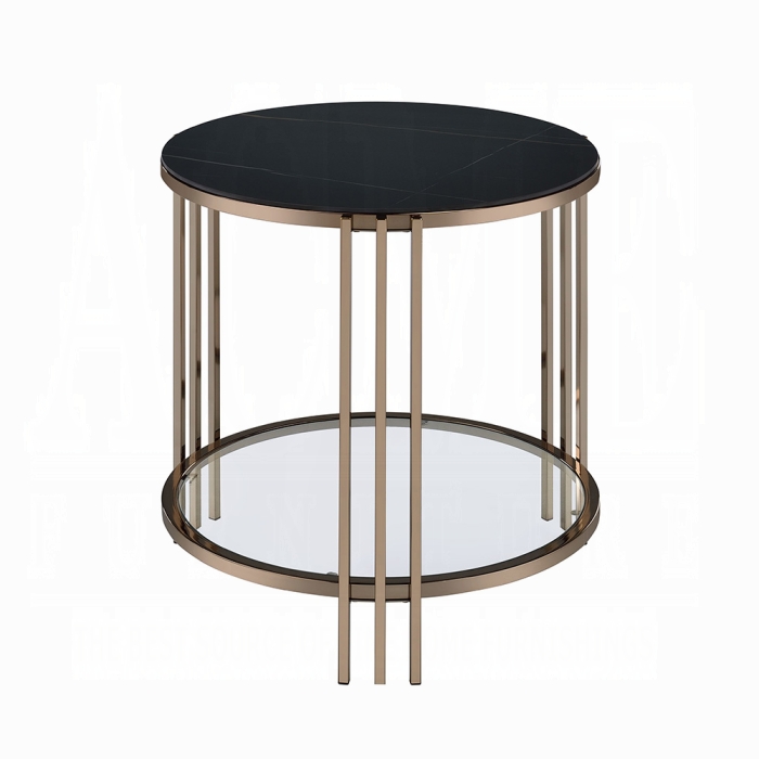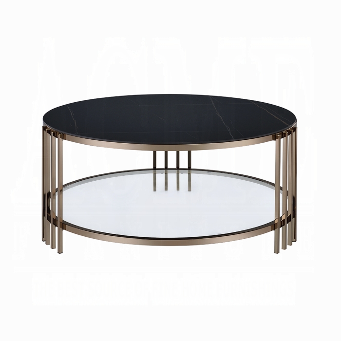 | The Zaidee Coffee Table features a sleek round sintered stone top paired with a modern champagne metal base, offering a perfect blend of elegance and durability for any contemporary living space. *Please note that the base price only includes (1) Coffee Table. Please add the additional end table to customize this set to your liking.